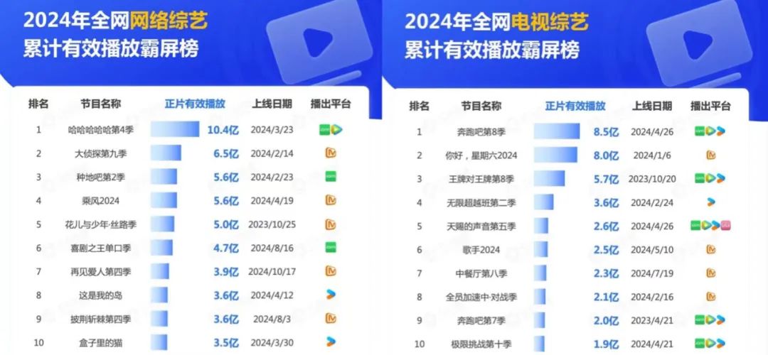 不仅如此,从年度云合榜单中,我们还可以看到芒果综艺节目的另一个隐患,那就是《歌手2024》的播放量远远大于收视率表现——成为全民热门话题的只有2.5亿,《再见爱人》第四季只有3.9亿,远不如观众长期稳定的“跑男”、“五哈”、“王牌”,而这些档都是爱优腾的三个联播。这就意味着芒果电视在话题营销上是完美的,但并没有成功地将大多数“吃瓜群众”转化为平台用户。。广告业收入连年下滑,也从另一个方面证实了上述现象。