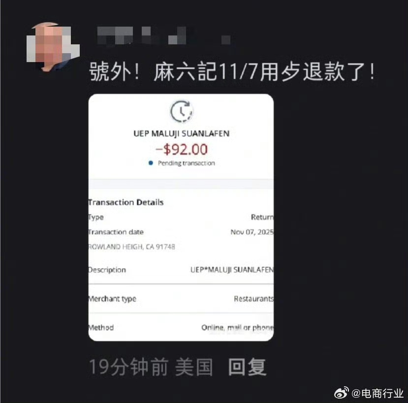 面对危机,一个名为“麻六记酸辣粉洛杉矶钻石广场店”的账号门店通过小红书紧急回应:将问题归因于“冷藏设备温度波动”,承诺对11月1日- 3日消费的顾客全额退款,并称已完成设备检修。