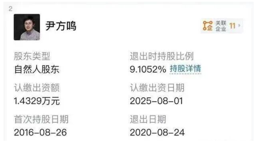 2020年8月,尹方鸣将个人直接持股,转为通过持股平台君万弘毅间接持有。此后,他转让部分老股,成为最早“提现”的股东之一。2025年5月,君万弘毅以5800万元的价格,向嘉兴睿利转让2.6万老股,为唯一一次公开套现。发行后,经穿透,尹方鸣通过君万弘毅,间接持有宇树0.46%的股权,价值接近2亿元。