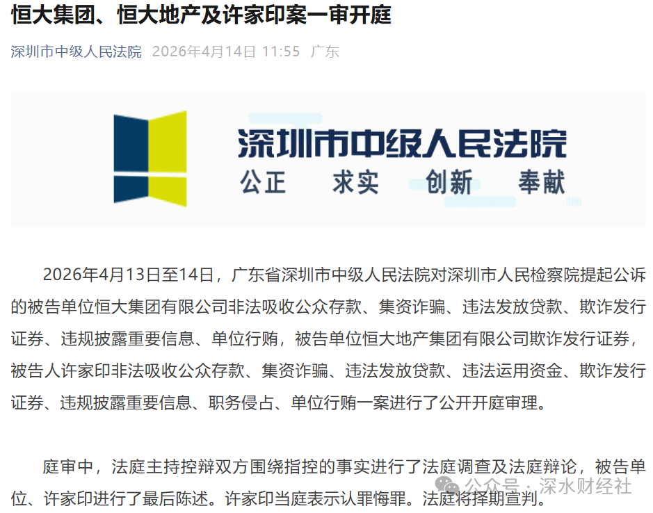 4月13日至14日,广东省深圳市中级人民法院对恒大集团及许家印等人所涉系列案件进行了公开开庭审理。