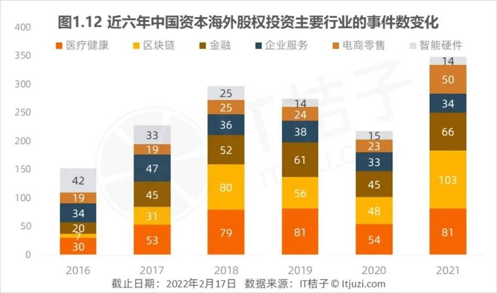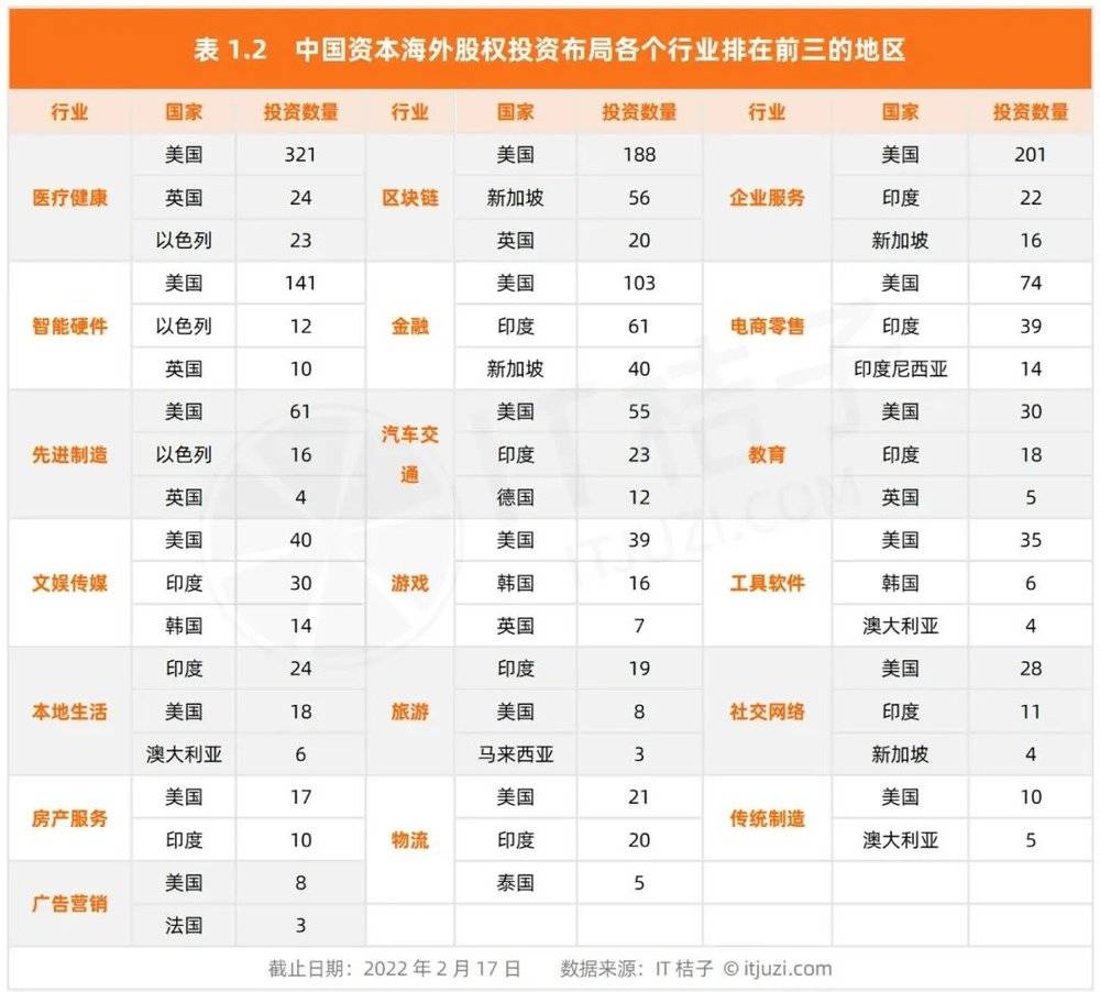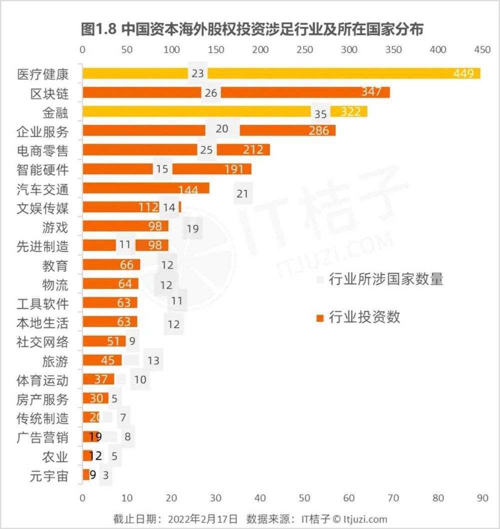 中国资本对超过20个海外国家布局的行业还包括医疗健康、电商零售、企业服务、汽车交通,而这几大行业也是中国资本比较热衷投资的海外行业,平均投资数量超过200起。