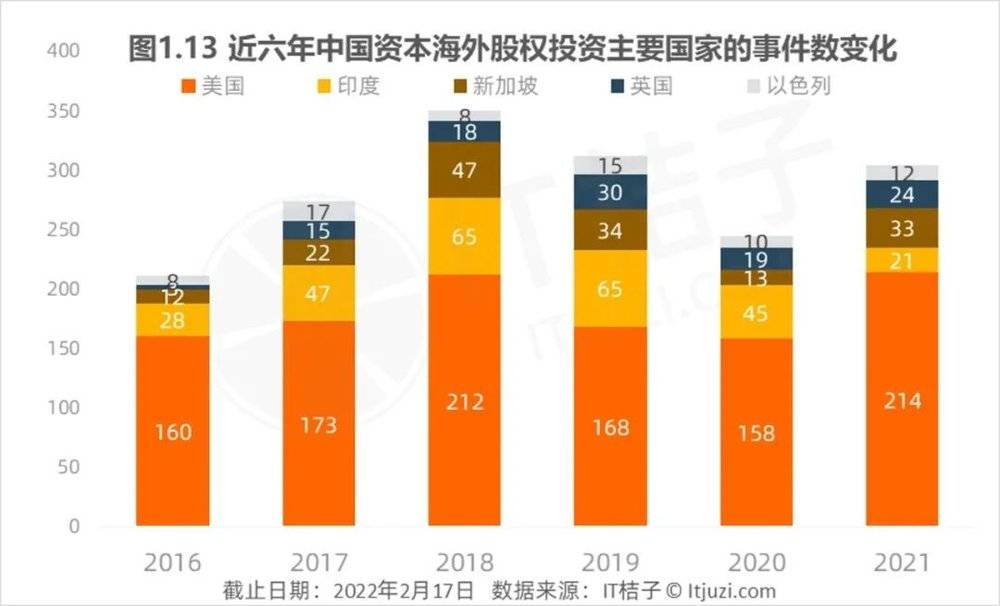 中国资本对美国创新企业的投资青睐度在近六年都是最高的,投资数量虽然有些高低起伏,但“第一名”的位置保持不变。中国资本对印度的投资在2016~2020年都是处在热度榜第二的位置,但2021年中国资本对印度的投资大为减少,而对新加坡的投资热度却明显增加。中国资本对印度投资大为减少,主要受最新政策影响。