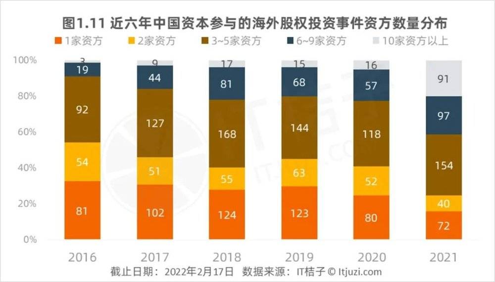 根据IT桔子数据,我们可以明显地观察到,在有中国资本参与的对海外投资中,由1家中国资方单独投资的事件占比呈现了明显的下滑趋势,从2016年的33%下降到了2021年的16%;由2家资本合投的事件占比也从2016年的21.6%下降到了2021年的8.8%。另一方面,6家以上资方共同投资的事件从2016年的22起增长到了2021年的188起,增长了8倍;占比从2016年的7%增长到了2021年的41%。