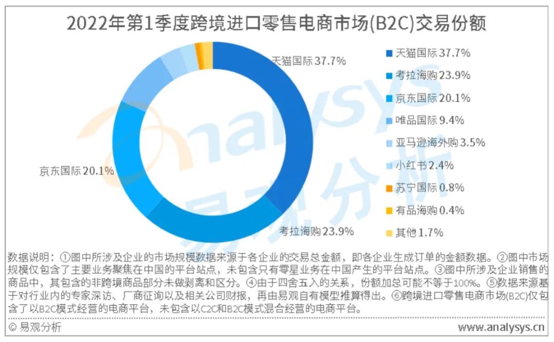 2022年第1季度部分平台交易份额环比有一定的变化:天猫国际排名第一,份额为37.7%,所占份额略微上升;考拉海购排名第二,份额为23.9%,所占份额环比有所下降;京东国际排名第三,份额为20.1%,所占份额环比有所上升。