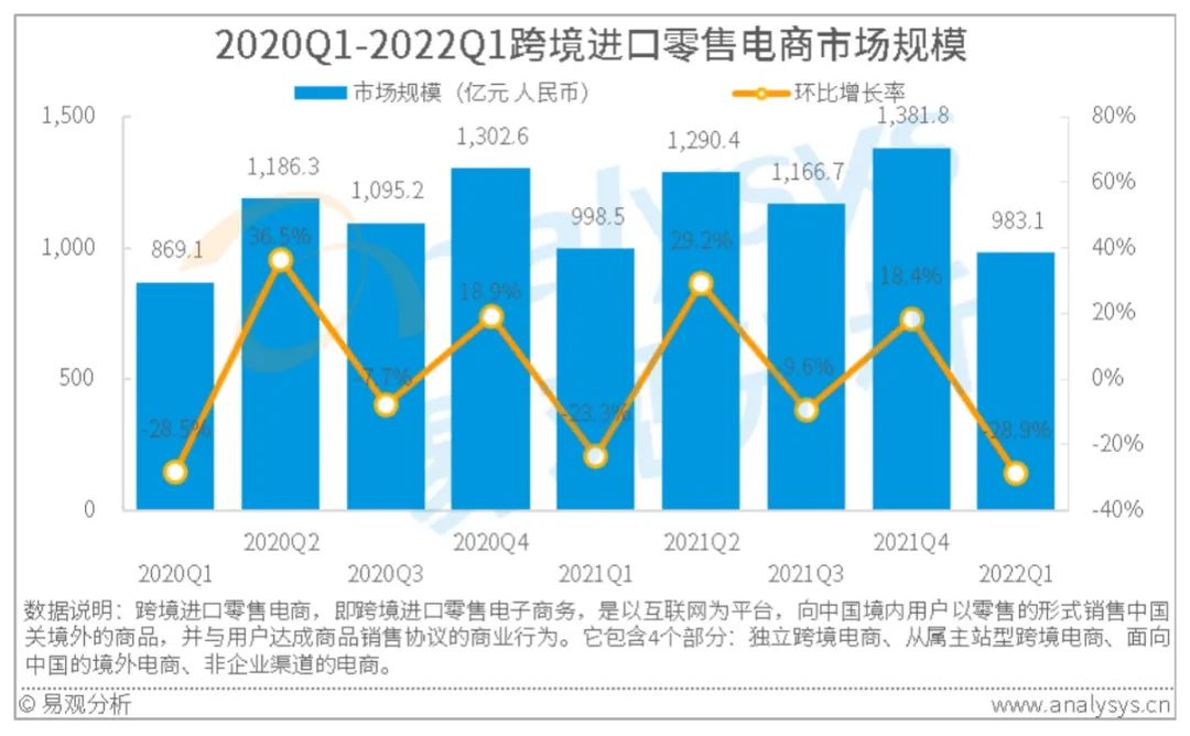 根据易观分析发布的《中国跨境进口零售电商市场季度监测报告2022年第1季度》数据显示,2022年第1季度,中国跨境进口零售电商市场规模为983.1亿元,环比下跌28.9%。
