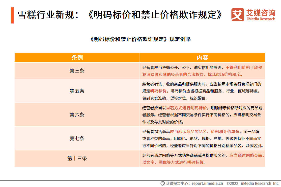 2022年7月1日,针对“雪糕刺客”等市场乱象,国家市场监督管理总局发布的《明码标价和禁止价格欺诈规定》(以下简称规定)正式实施。规定表明,经营者需要对商品明码标价,不得以价格手段侵害消费者权益,扰乱市场价格秩序,违反者将予以严惩。雪糕行业发展得到进一步规范。