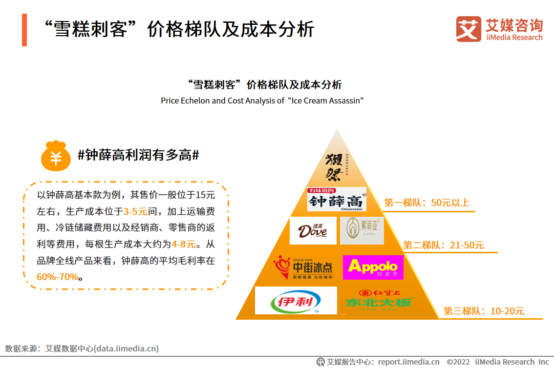 数据显示,“雪糕刺客”价格梯队大致可分为三档,其中,第三梯队的“雪糕刺客” 价位位于10-20元,仍能被部分消费者所接受;第二梯队的“雪糕刺客”价位位于21-50元,消费者购买意愿大幅下降;第三梯队“雪糕刺客”售价一般位于50元以上,仅有小部分消费者愿意购买。而在生产成本上,以钟薛高基本款为例,其生产成本位于3-5元,全线产品平均毛利率在60%-70%。