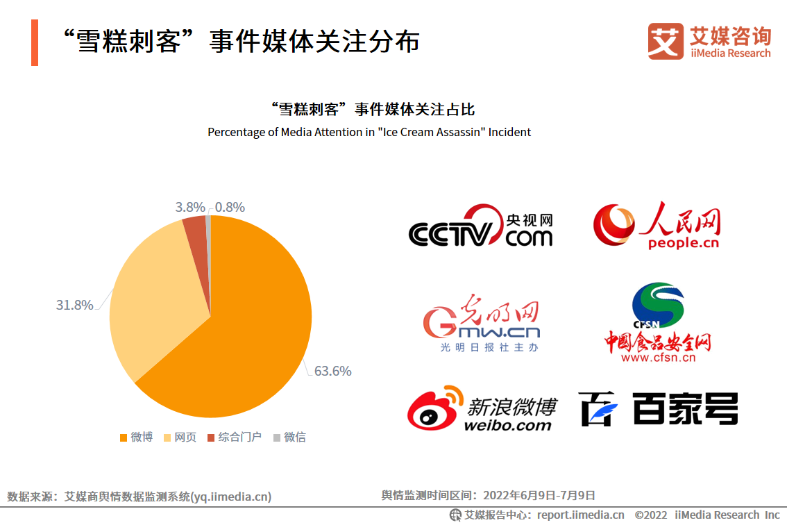 数据显示,“雪糕刺客”事件的媒体传播渠道以微博(63.6%)为主,并与新闻网页(31.8%)、综合门户(3.8%)等共同构成传播矩阵。此外,央视网、人民网、光明网等官方媒体在此次事件传播中发挥重要作用,百家号、公众号等平台也提供了发声渠道。