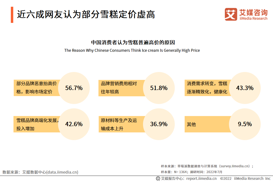 调研数据显示,56.7%的网民认为部分品牌恶意抬高雪糕价格;51.8%的网民认为雪糕品牌营销费用增多。此外,也有43.3%网民认为消费需求转变,导致雪糕品牌逐渐向高端化发展。艾媒咨询分析师认为,各大品牌纷纷加大线上营销力度,抢占流量,投入费用进一步增加。但高端雪糕难以适应大众化市场,并不能成为雪糕市场的广泛存在。