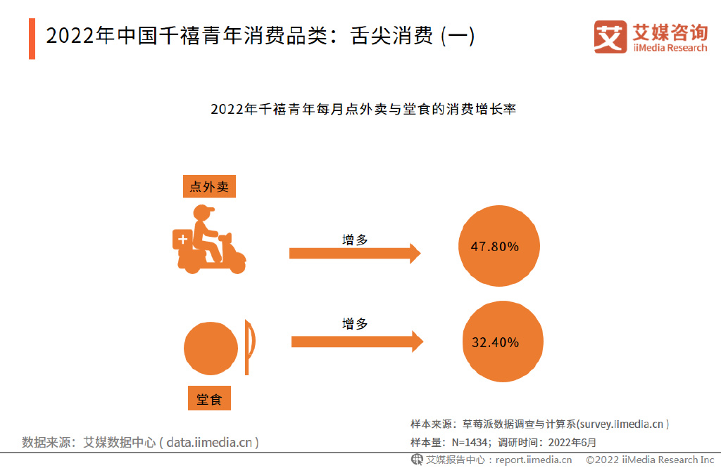 艾媒咨询数据显示,千禧青年点外卖的频率较2021年增长了47.80%。艾媒咨询分析师认为,疫情影响下,堂食取消是外卖消费比例增加的主要原因之一。