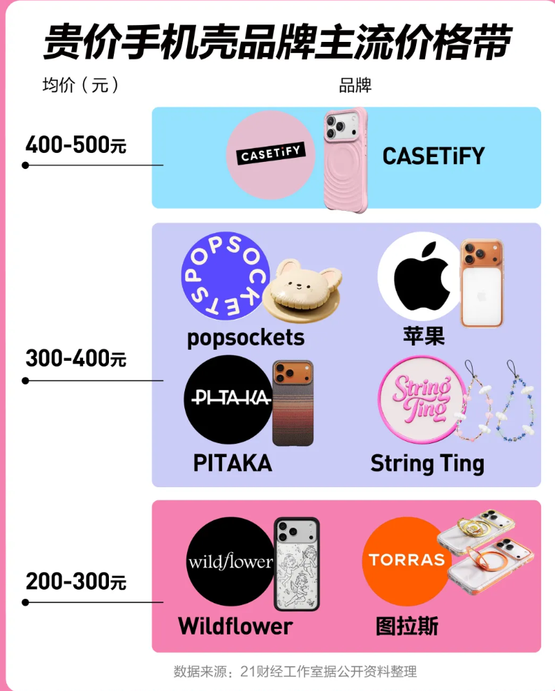 21世纪经济报道记者发现,不仅是CASETiFY,手机配件圈已出现多个高端品牌。popsockets气囊支架+CASETiFY手机壳+String Ting手机链,配齐这样一套网红手机配件竟然要花3000多元,足以购买半部标准版iPhone17。