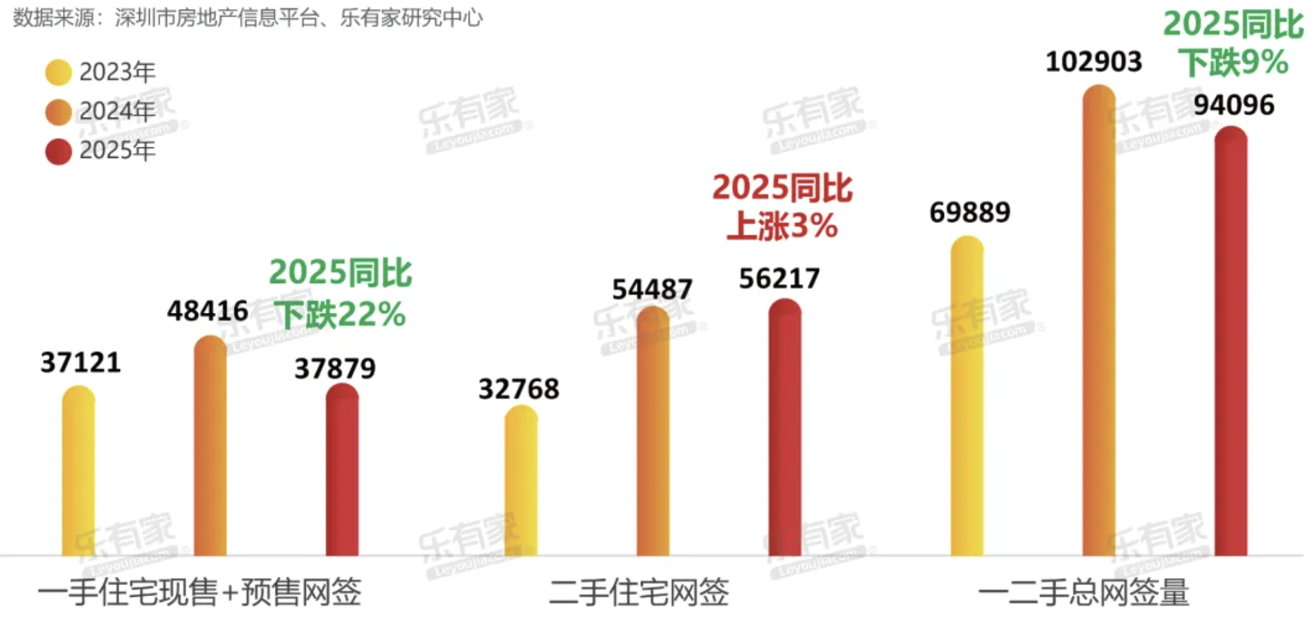 2025年,深圳一二手住宅全年网签总量约9.4万套,同比下降9%。其中,一手住宅全年网签37879套,同比下滑22%;二手住宅网签56217套,同比上涨3%,成交占比进一步提升,成为支撑市场的重要力量。孟凡振表示,二手房成交量已连续三年回升,反映出存量市场流动性正在修复,真实居住需求逐步释放。