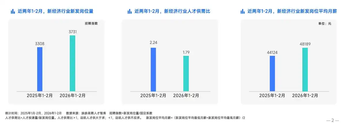 《洞察》显示,2026年1-2月,新经济行业新发岗位量同比增长12.77%,招聘需求明显回温。与此同时,人才供需比从2025年同期的2.24下降至1.79,即从“约2.24人竞争1个岗位”下降至“约1.79人竞争1个岗位”,求职竞争压力有所缓解。