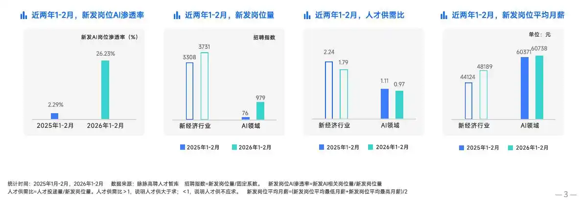 AI已成为2026年春招最核心的人才争夺赛道。2026年1-2月,AI岗位数量同比增长约12倍,远高于新经济行业整体增幅。AI岗位在全部新经济岗位中的占比也从2025年同期的2.29%跃升至26.23%。
