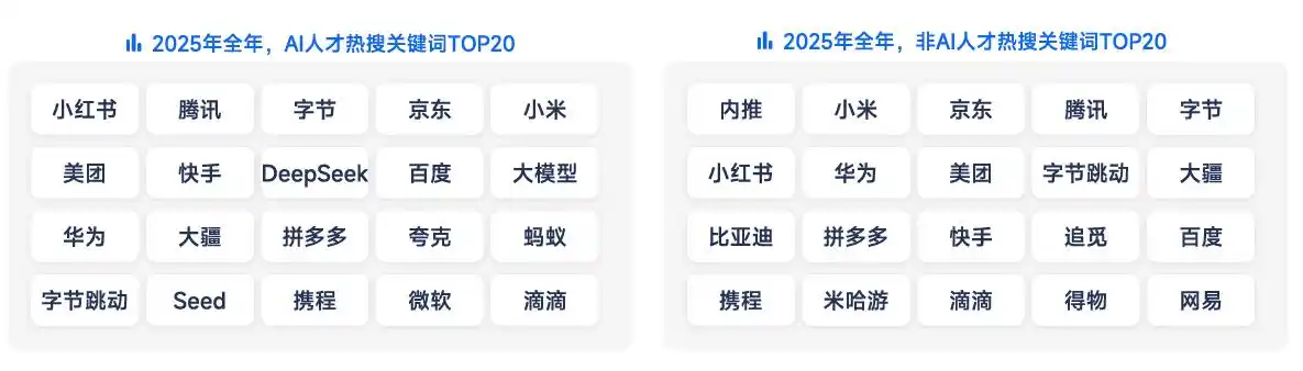 从该平台用户热搜词分布来看,新经济⼈才普遍⾼度关注科技⼤⼚,如腾讯、字节、京东、⼩⽶、美团、快⼿、华为、百度、拼多多等。同时,AI⼈才的搜索更偏向技术与AI相关领域,如DeepSeek、大模型、微软、夸克、Seed、蚂蚁等。非AI人才的搜索则更偏向传统头部大厂与求职渠道本身,“内推”一词位列其热搜榜首,同时他们对比亚迪、大疆、米哈游、得物、网易、追觅等各个赛道的头部企业关注度更高。