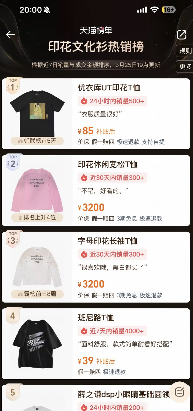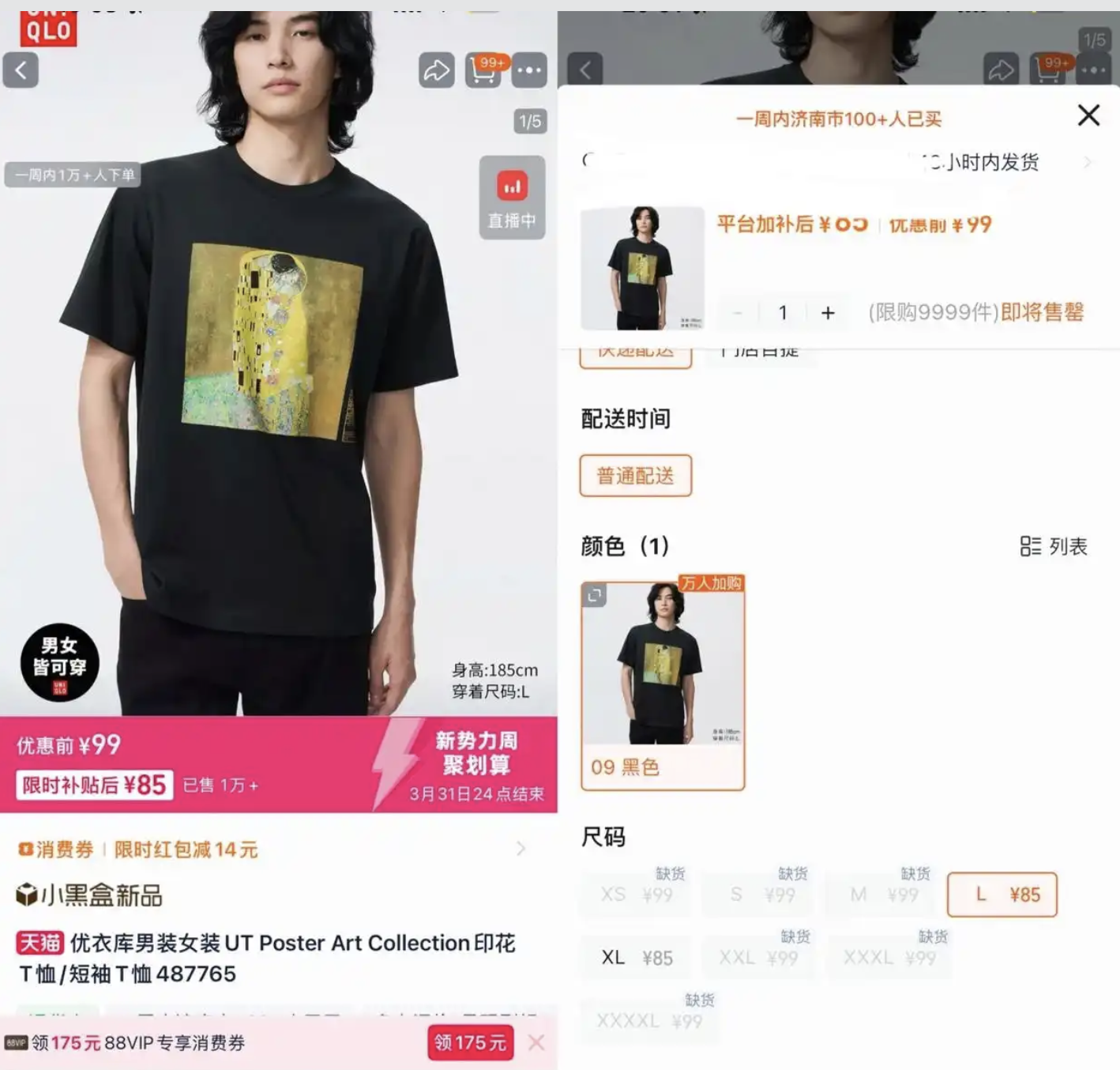 3月25日,海报新闻记者在淘宝天猫优衣库官方旗舰店看到,该T恤原价99元,优惠价格85元,近7天超6万人浏览、1万余人下单,目前仅剩L、XL码在售,小码及XL以上码数全面售罄。该T恤也迅速登上了天猫印花文化衫热销榜第一名,并已蝉联榜首5日,该榜单显示24小时内销售超500件。