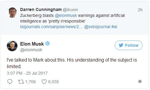 马斯克显然不高兴,发推称:“我和扎克聊过人工智能,他对这个领域的了解很有限。”意思就是,说得好下次别说了,你懂什么啊你?