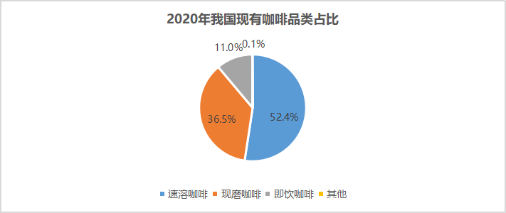 中国咖啡市场目前以速溶咖啡、即饮咖啡和现磨咖啡为主。2020年速溶咖啡占比52.4%,这与早期雀巢等国外巨头的市场培育有关。随着消费不断升级,以大型连锁咖啡品牌为主的现磨咖啡,已是未来发展重要趋势。