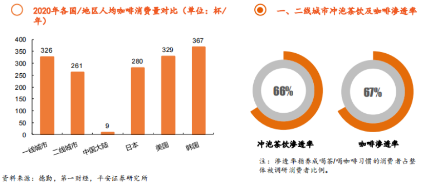 尽管如此,2020年一、二线城市,人均年咖啡消费量为326杯、261杯,接近日、美、韩等成熟咖啡市场水平。咖啡渗透率达67%,与冲泡茶饮渗透水平相当。