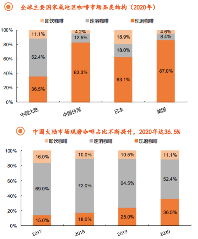 平安证券研究显示,我国现磨咖啡占比从2017年的15%增长至2020年的36.5%,而美、日等主要国家及中国台湾的现磨咖啡占市场主体,分别占83.3%、63.1%、87.0%。