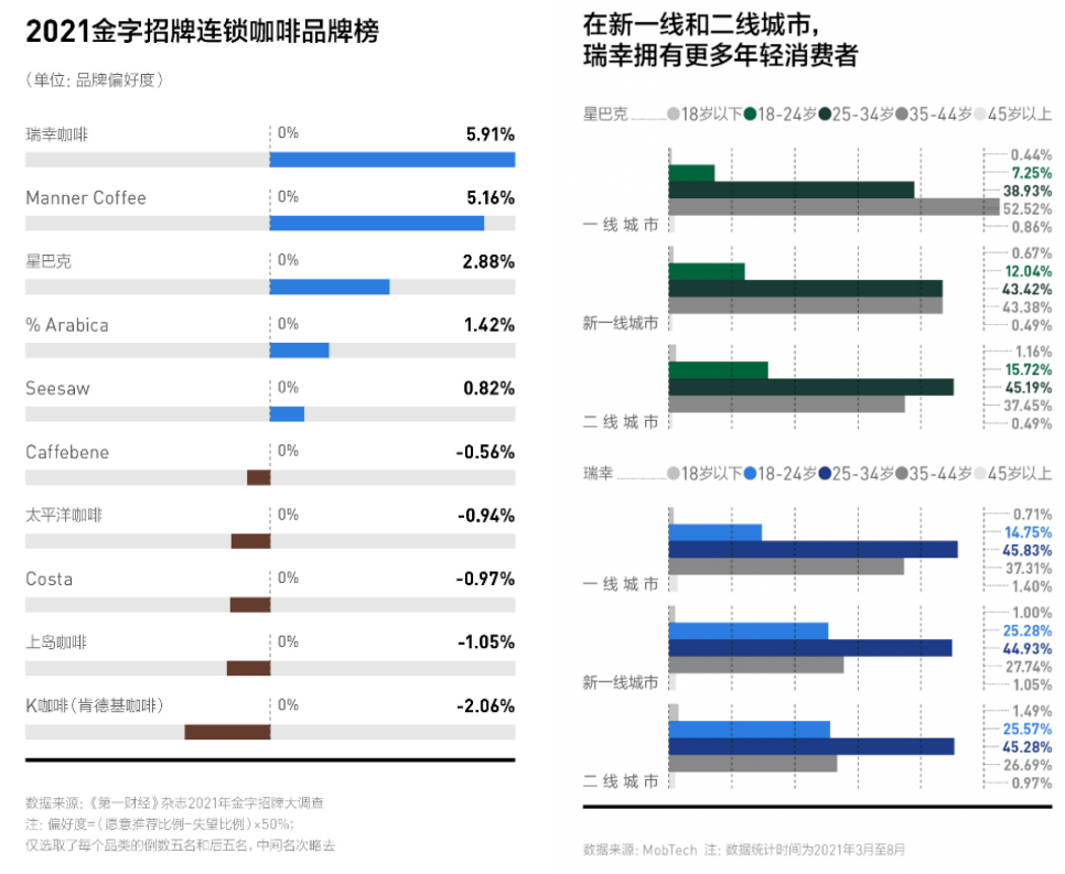 2021年,《第一财经》杂志的“金字招牌”公司人品牌偏好度调查中,瑞幸首次在连锁咖啡类目中排名第一。