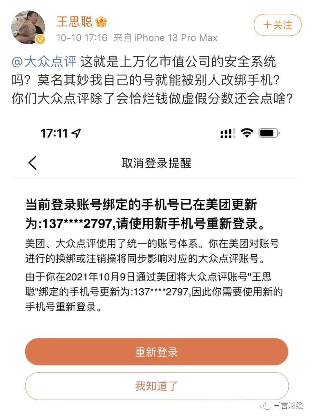 2021年10月10日,王思聪在微博发文称:“这就是上万亿市值公司的安全系统吗?莫名其妙我自己的号就能被别人改绑手机?你们大众点评除了会恰烂钱做虚假分数还会点啥?”