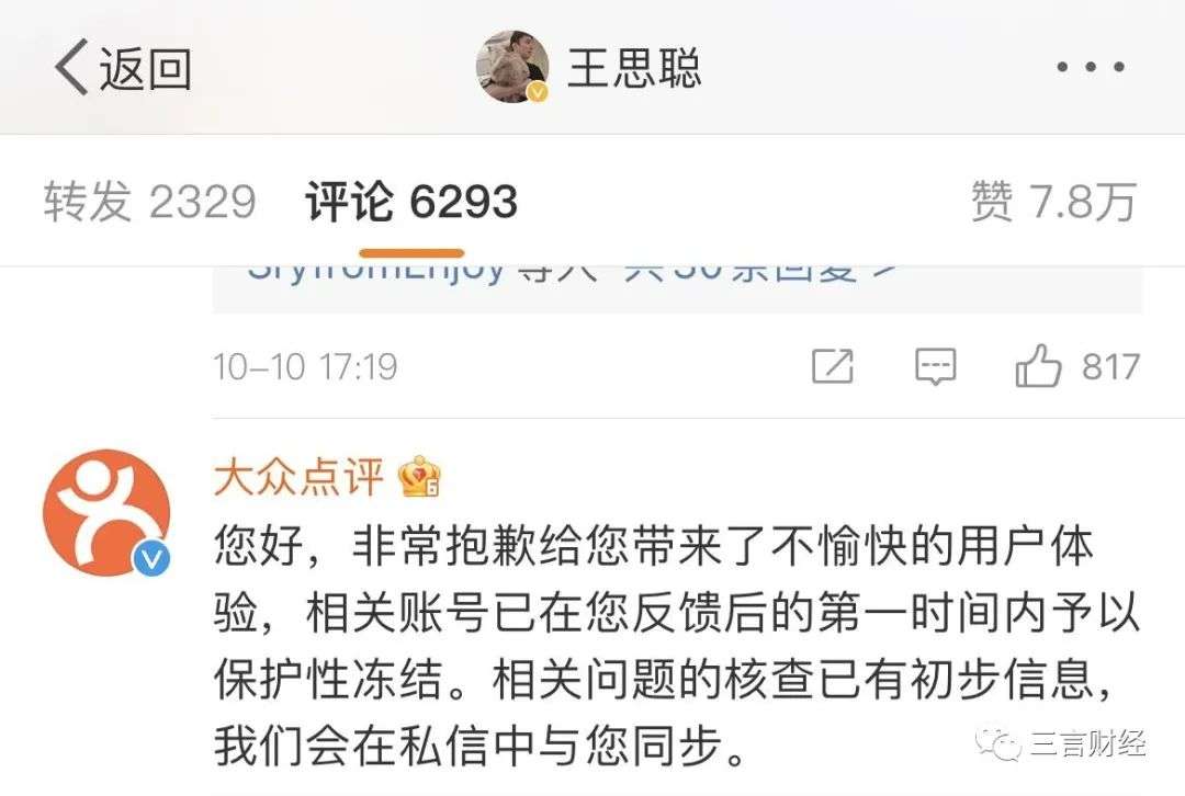 大众点评在该条微博下评论称,相关账号已在王思聪反馈后的第一时间内予以保护性冻结。相关问题的核查已有初步信息并将与王思聪本人进行私信同步。