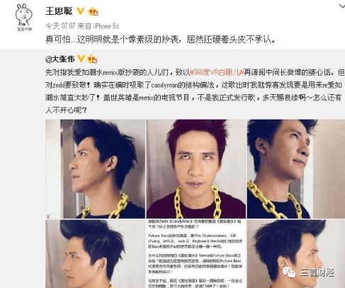 2016年9月5日,王思聪突然转发大张伟微博,指责其改编的歌曲“像素级的抄袭,却居然硬着头皮不承认”。