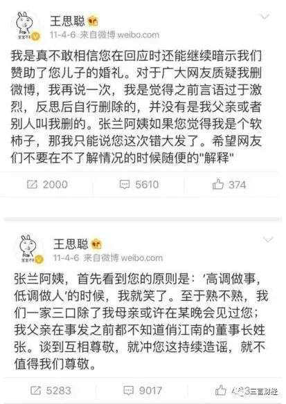 王思聪直接发文怒怼张兰,“真不敢相信,你能说是我们赞助了你儿子的婚礼”“我们一家三口,除了我母亲或许见过你,我父亲压根儿就不知道俏江南的董事姓张”。