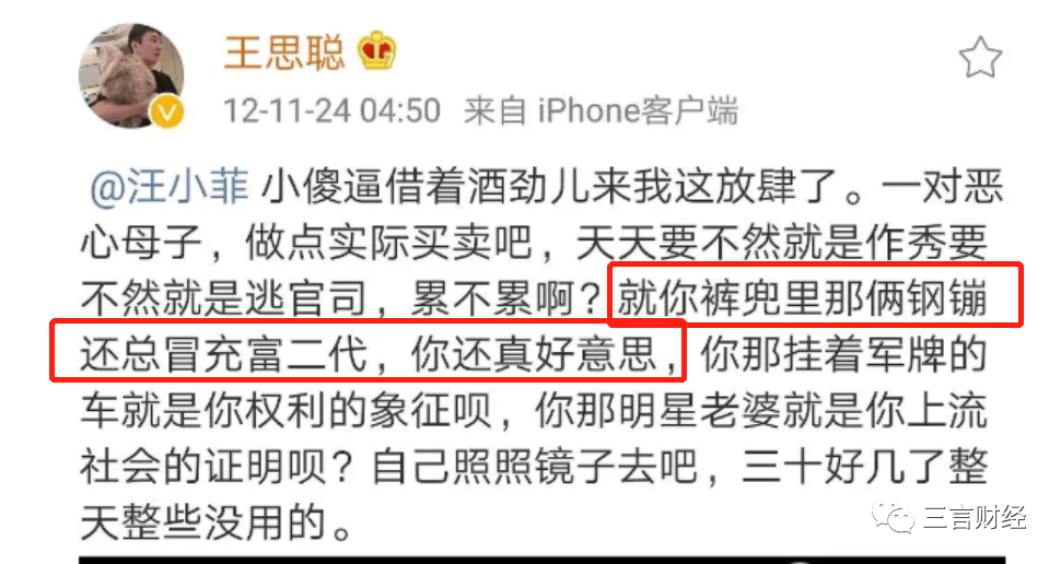 王思聪回复汪小菲,“就你裤兜里的俩钢板,还冒充富二代,你还真好意思”。