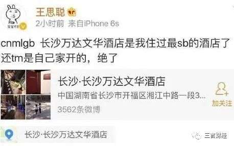 2016年,王思聪在长沙录制节目后下榻万达酒店,结果半夜闹肚子去上厕所,却发现厕所没有纸,于是王思聪凌晨发微博怒斥自家酒店:“万达酒店是我住过的最SB的酒店,还tm的是自己家开的 ,绝了!”