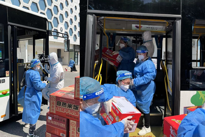 4月20日消息,日前,配有“上海生活物资保障”通行证的一辆电动公交车从家乐福上海盈漕店出发,车上满载牛奶、鸡蛋、蔬菜、油盐酱醋、大米、方便面、自热米饭等民生生活必须品,以及为小区老人、儿童等特殊人群准备的成人纸尿裤、儿童奶粉等生活用品,开到上海市青浦区西部一区、名人苑、崧子苑、盘龙浦等小区门口,为身处管控区的小区带来新一轮补给。