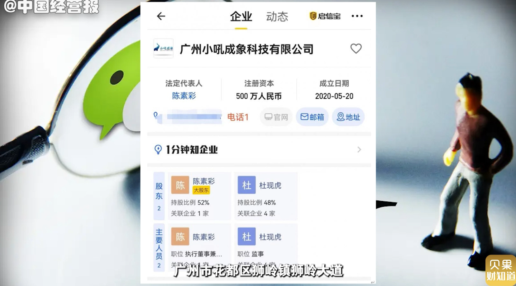 小吼成象科技公司,注册地址位于广州市花都区狮岭镇狮岭大道,成立于2020年5月20日,注册资本500万元,法定代表人为陈素彩持股52%,另一位股东杜现虎持股48%。