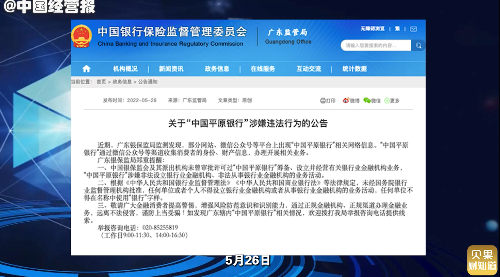 近期,一家名为“中国平原银行”的相关信息在网上传播,引起金融监管部门注意。5月26日,广东银保监局在其官网发布《关于“中国平原银行”涉嫌违法行为的公告》。