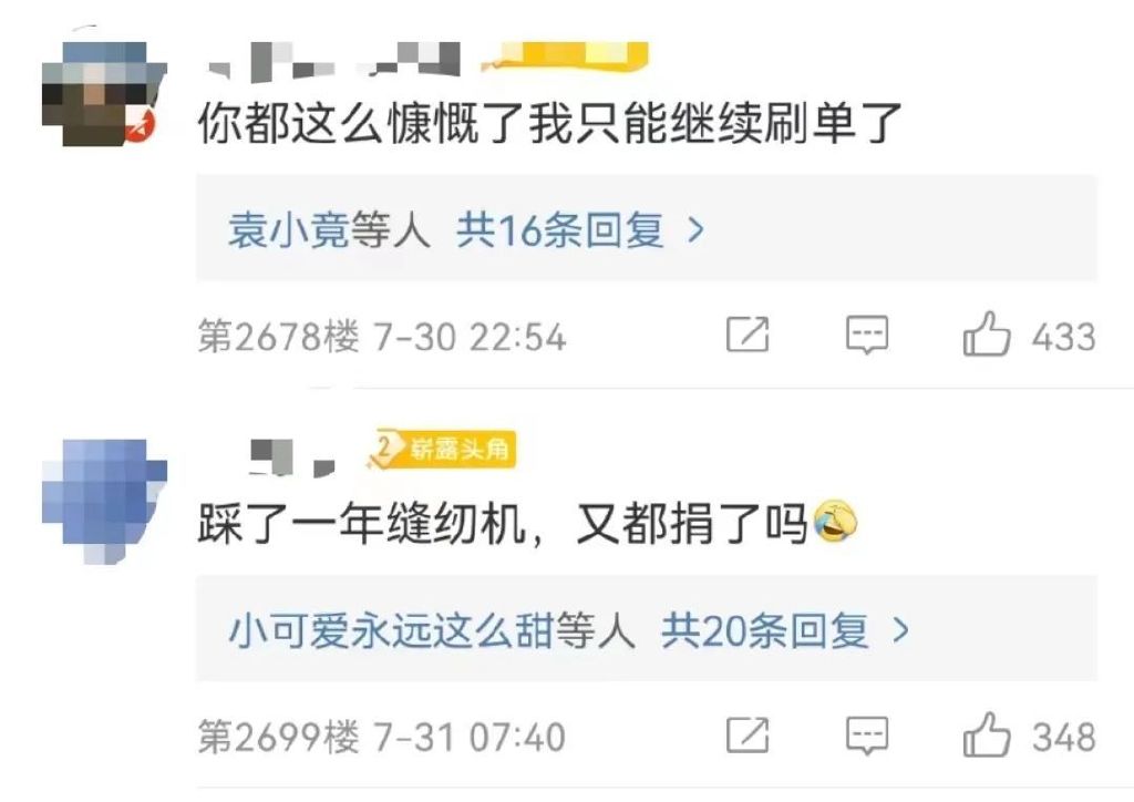 对此,有网友评论:“这也太正能量了,赚点钱都捐了”“踩了一年缝纫机,又都捐了吗”。