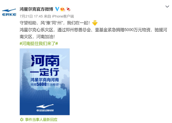 去年7月,鸿星尔克在微博低调宣布,将向河南捐赠5000万元物资。