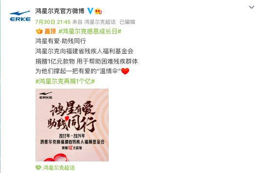 7月31日上午,被捐赠方福建省残疾人福利基金会官方微信发文称,鸿星尔克庄严承诺再捐出总价值1亿元的物资和善款,设立“鸿星有爱•助残同行”项目。