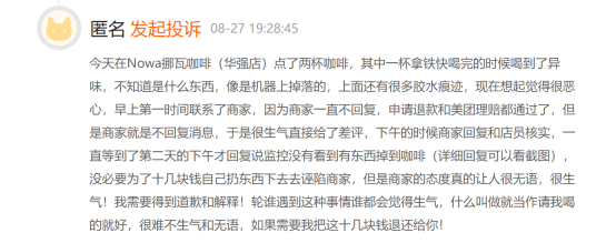 甚至在这些社交平台上,都能发现不少用户表示踩雷,不同门店的产品和服务差异大,同样面临连锁店品控不足的问题。在黑猫投诉[投诉入口]上,有消费者反映,拿铁快喝完的时候喝到了异味,不知道是什么东西,像是机器上掉落的,上面还有很多胶水痕迹,现在想起都觉得很恶心,商家不回复消息的态度让消费者感觉很生气。