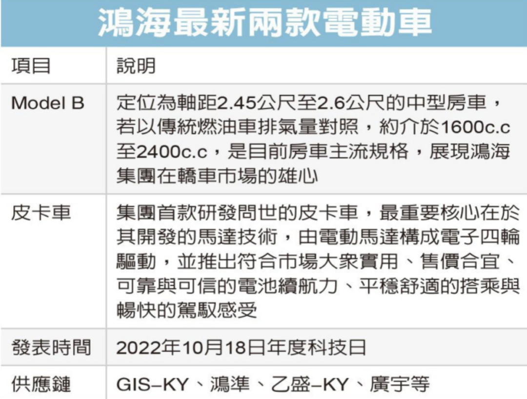 最新消息显示,鸿海内部正研发两款新电动车,包括Model B系列轿车和首款皮卡,预计10月18日的年度科技日亮相。有意思的是,Model B的轴距将会达到2.45-2.6公尺,定位中型房车。
