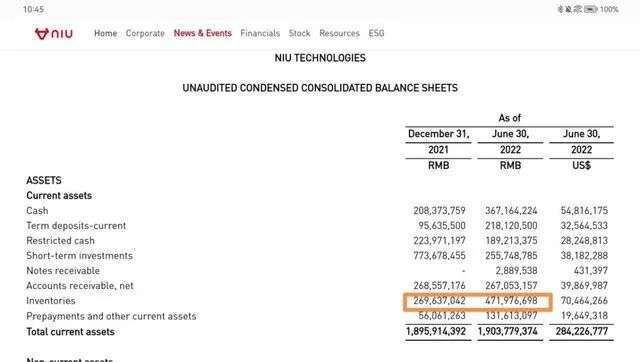 小牛电动提价带来的还有另一个恶果——库存增加。财报显示截至2022年6月30日,小牛电动的库存是4.72亿元左右,2021年年末,小牛电动的库存为2.69亿元,增长近50%。一季报时库存是3.459亿元,二季度库存增加了1.26亿元,增加比例36.46%。
