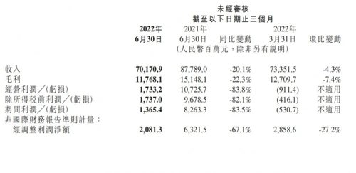财报显示,报告期内小米第二季度营收701.7亿元,下滑20.1%;略好于市场预估的698.6亿元;经调整后净利润20.8亿元,下滑67.1%,略超市场预估的19.9亿元;2022年第二季度毛利为118亿元,同比减少22.3%。