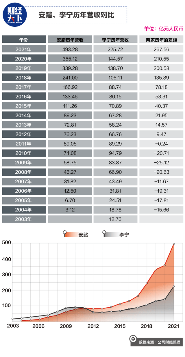 《财经天下》周刊梳理发现,2013年安踏比李宁营收高14.57亿元,2014年这个数字变成21.95亿元,2015年差距扩大至40.37亿元,2016年变为53.31亿元,2017年涨至78.18亿元,2018年首次突破百亿大关达135.89亿元,2019年则突破了两百亿达200.58亿元,2020年超210.55亿元,2021年高267.56亿元,画出了不断向上的曲线。