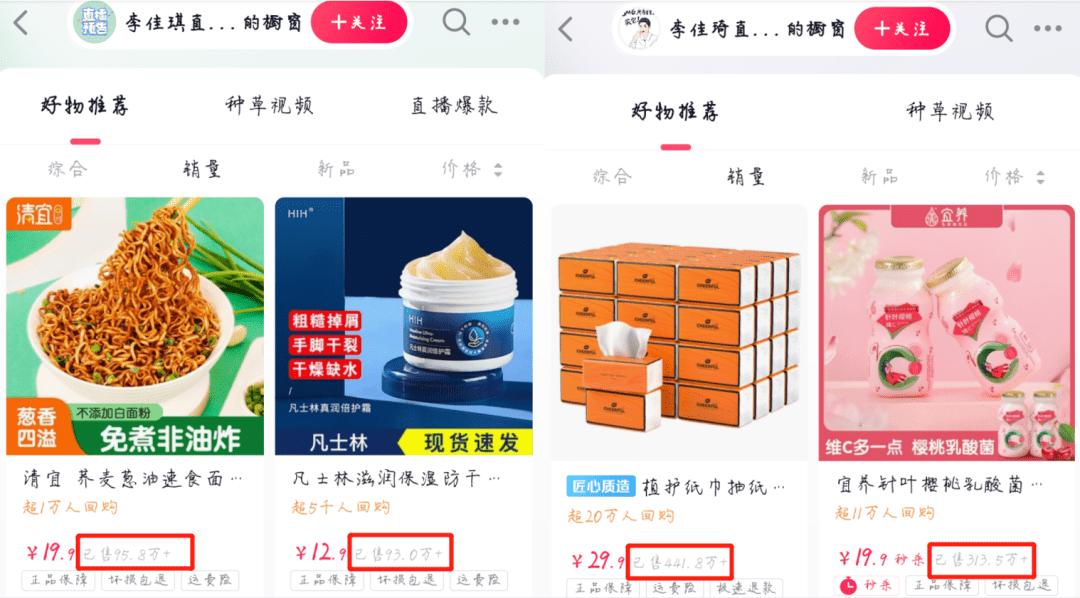 以“李佳琦直播推荐”和“李佳琦直播间好物推荐”这两个账号为例,一个账号粉丝量为1.4万,另一个账号仅7000多粉丝,但点进橱窗后,可以看到橱窗内的商品销量高达几十万,甚至几百万!