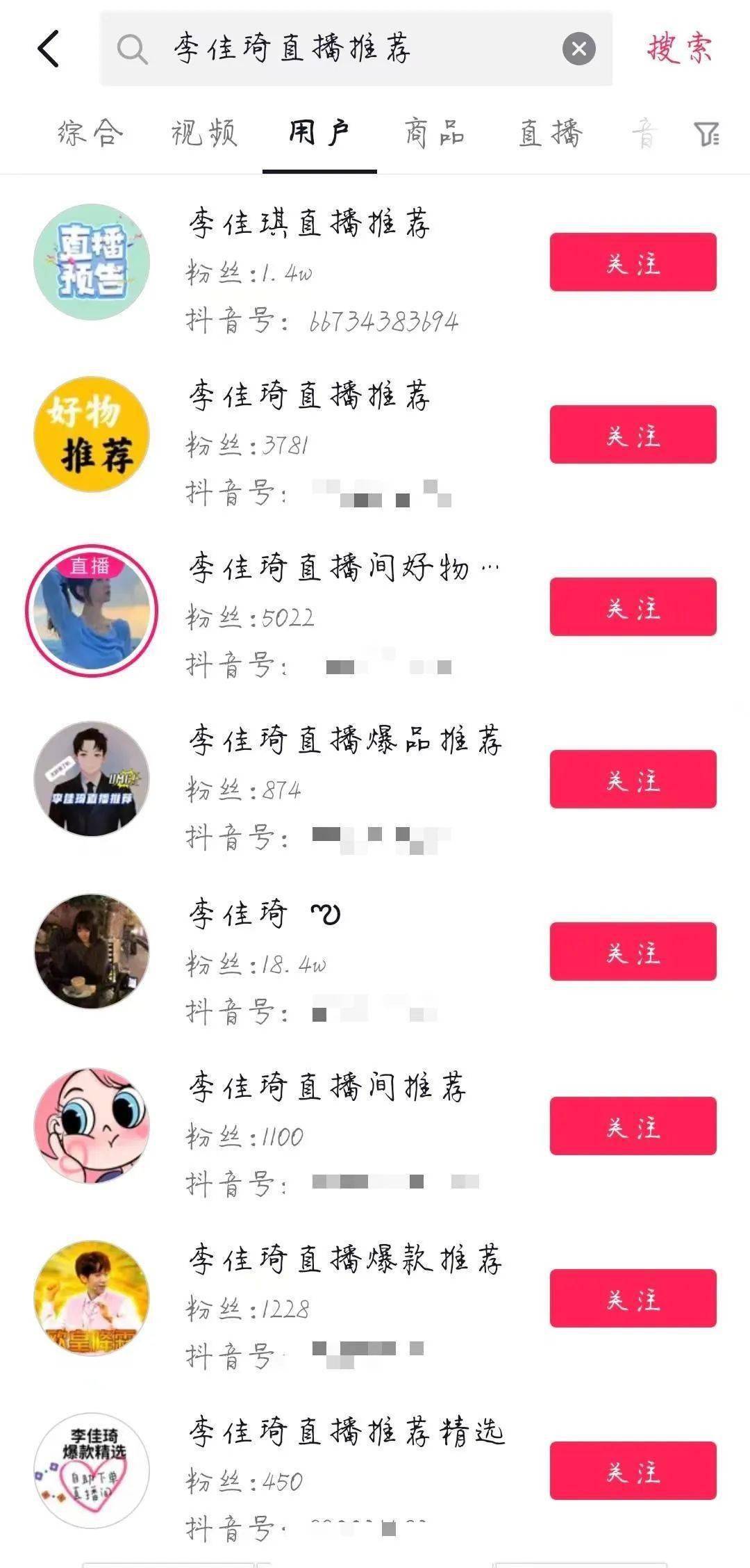 事实证明这并不是空穴来风。以抖音中近期兴起的李佳琦直播切片为例,有超过30个账号的名称使用了“李佳琦推荐”“李佳琦直播好物”等关键词,粉丝量从几百到上万不等。