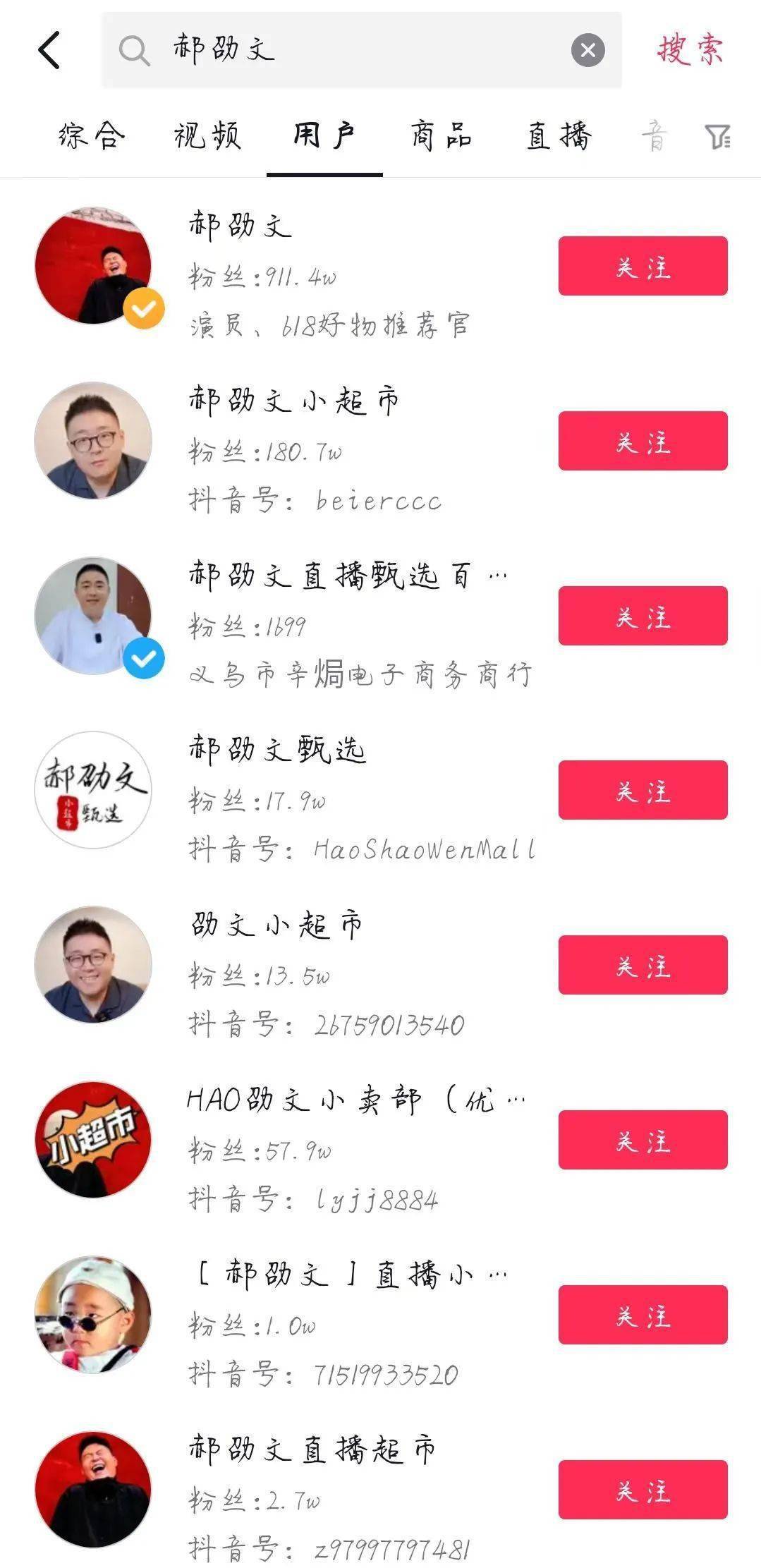 现在在抖音上搜索“郝劭文”,就会弹出一系列郝劭文的直播切片账号,且粉丝量也从几十万到上百万不等。