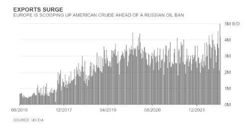 其实,在俄乌冲突爆发以来,美国向欧洲出口的能源量持续飙涨。据美国官方的数据显示,美国原油的出口量一度达到了前所未有的500万桶/天。