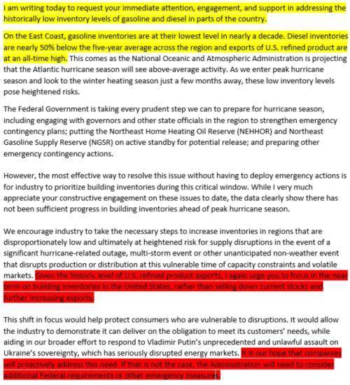 此前,美国能源部长已经向美国七家主要炼油巨头发送了信函,据媒体泄露的文件副本,美国能源部长Jennifer Granholm在信函中强制要求美国七家主要炼油厂减少出口,把短期工作重点集中在油气补库存上。