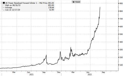 另外,英国的远期电力价格也直冲云霄,从6月的242英镑/兆瓦时,飙升到1000英镑/兆瓦时。