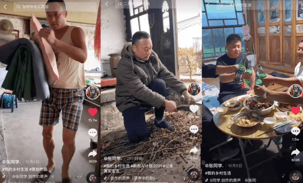2021年10月才入驻抖音的张同学,住着破旧的乡下平房,带着工人常戴的针织手套,家里甚至没什么拿得出手的家电。视频与“精致”完全不沾边,内容记录的也全是“流水账”式的农村日常生活,起床、做饭、喂狗、养鸡......