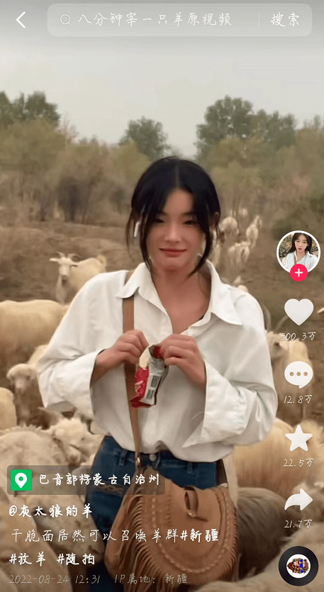 其实“灰太狼的羊”最开始出圈的作品是干脆面召唤羊群,在羊群中打开干脆面后,羊群迅速将她团团围住,羊群奔跑扬起的沙尘与女孩羞涩的表情,直接把反差感拉满,该视频共获得了300万网友的点赞。